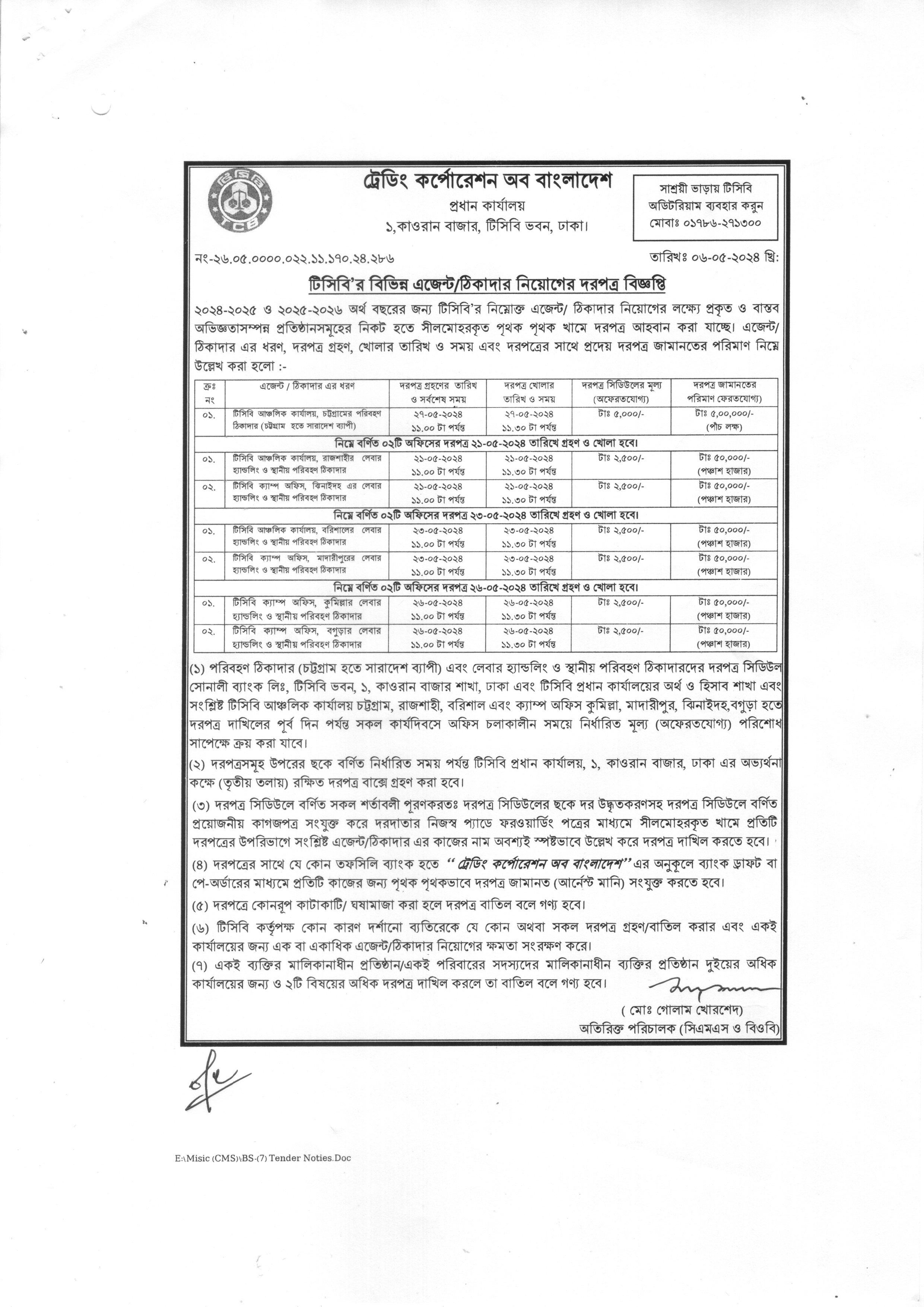 | ১০ | টিসিবি’র বিভিন্ন এজেন্ট/ঠিকাদার নিয়োগের দরপত্র বিজ্ঞপ্তি | 26.05.0000.022.11.170.24.286 | | | ০৬-০৫-২০২৪ | দেখুন |